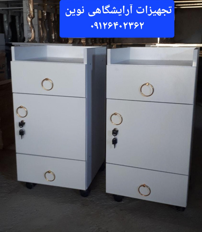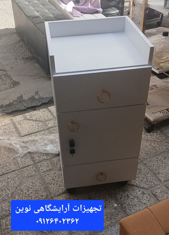 ترولی آرایشگاهی چوبی کشودار دردورنگ سفیدمشکی هزینه ارسال به صورت پس کرایه به عهده مشتری میباشد