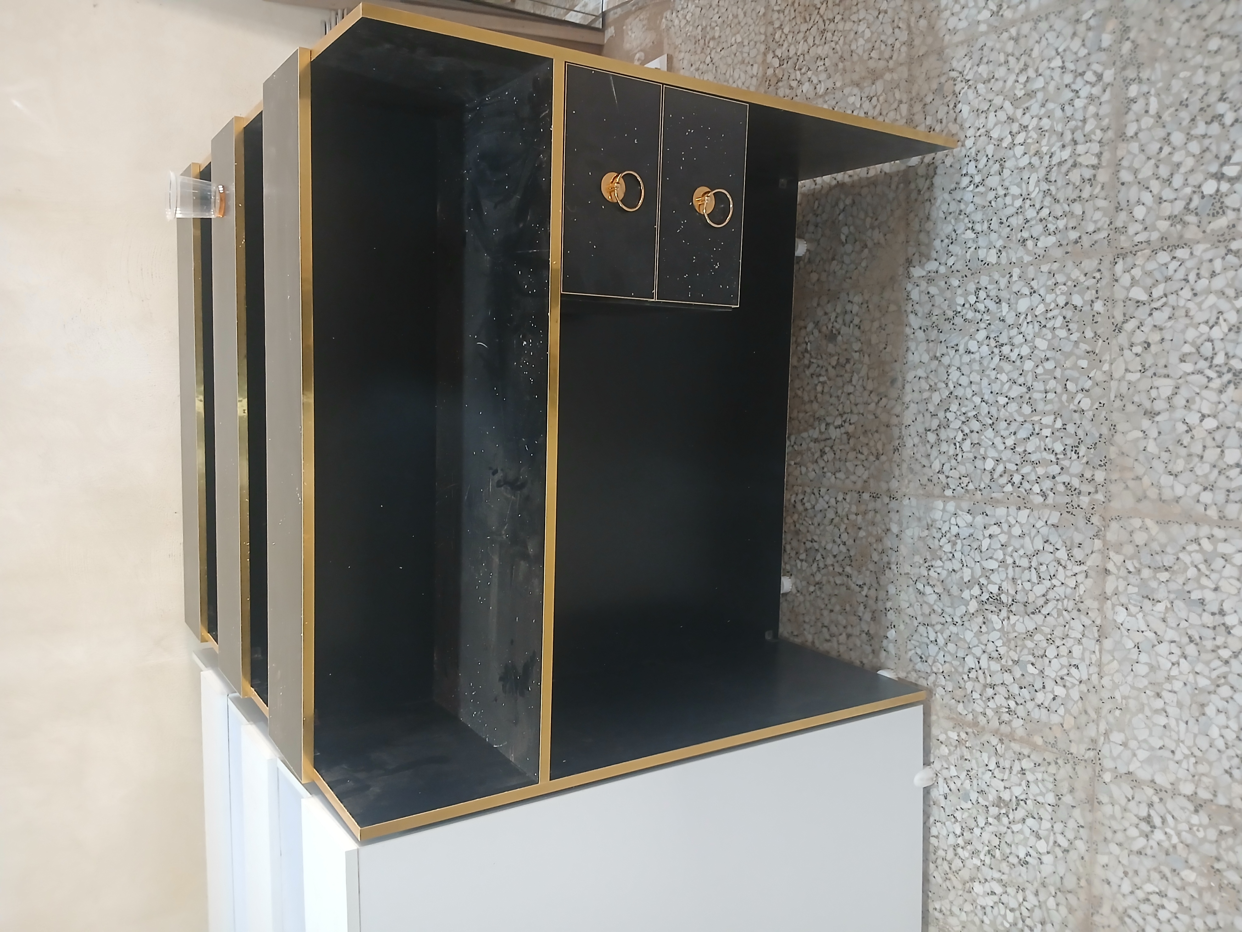کانتر ام دی اف دررنگ بندی سفید ومشکی ۴۰دریک متر میباشد ودارای دوکشو در قسمت پشتی و دارای چراغ در قسمت جلو کانتر میباشد مناسب برای دفترکار آرایشگاه بوتیک و.....ارتفاع کانتر از زمین یک متر میباشد کانتر دررنگ های مختلف ساخته میشود که در این صورت افزایش قیمت دارد