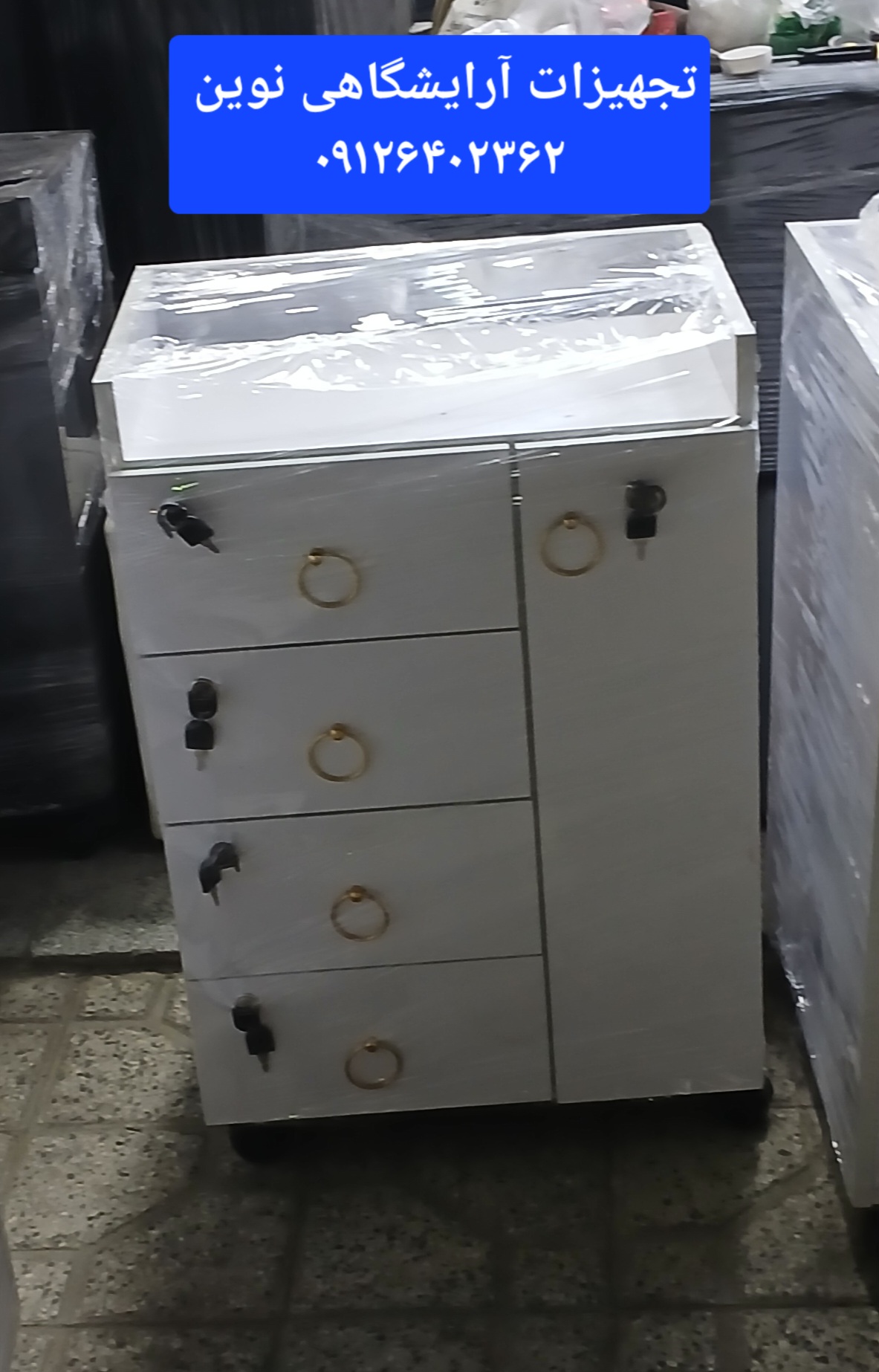 ترولی چوبی آرایشگاهی دارای چهارکشو و یک درقفلدار میباشد که کشو نیز قفل دار میباشد در ابعاد عمق ۴۰در۵۵ارتفاع ۸۰ وچرخدار میباشد دررنگ بندی سفیدومشکی