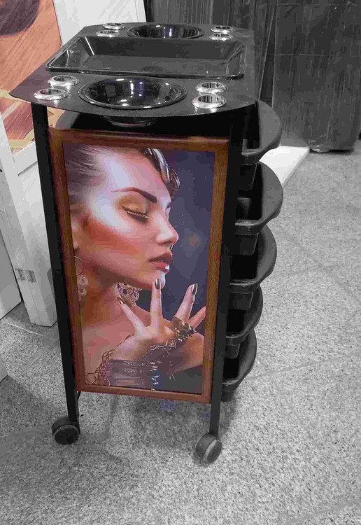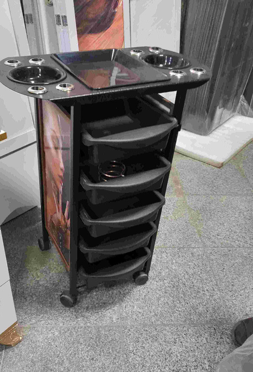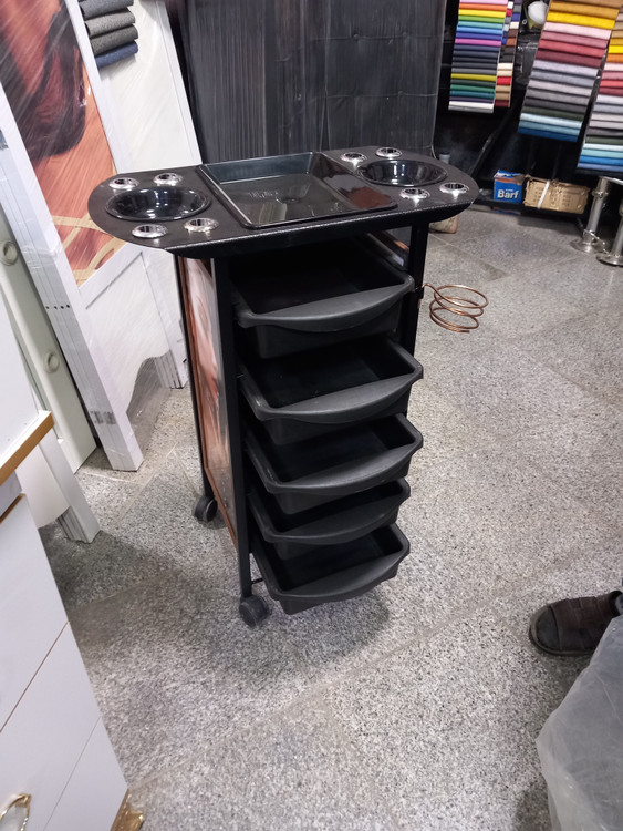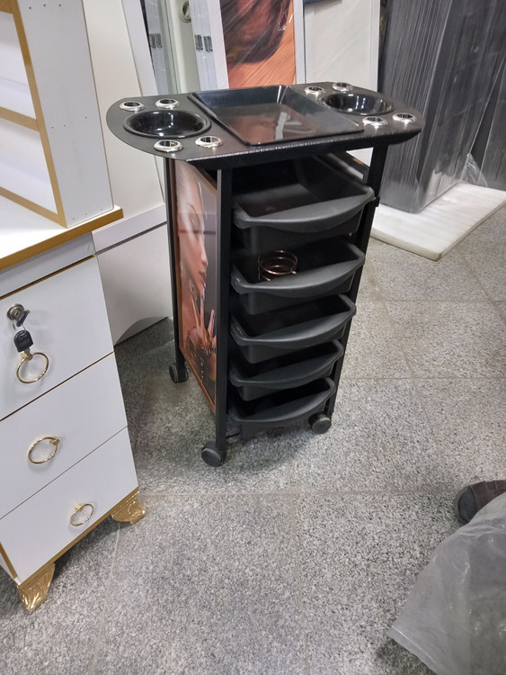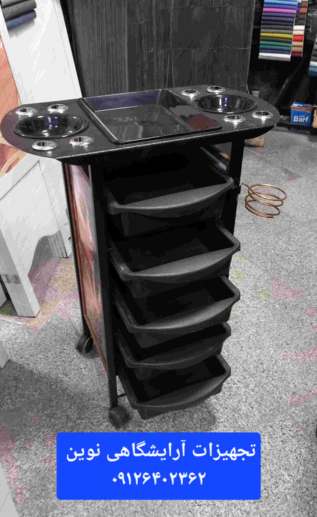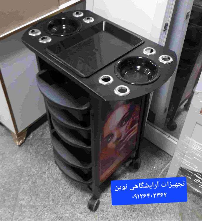 ترولی آرایشگاهی بدنه فلزی دارای ۵وشو پلاستیکی مشکی میباشد دردومدل ساده وعکس دار ورنگ بندی مشکی وسفید میباشد