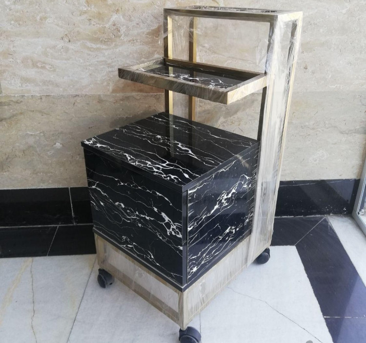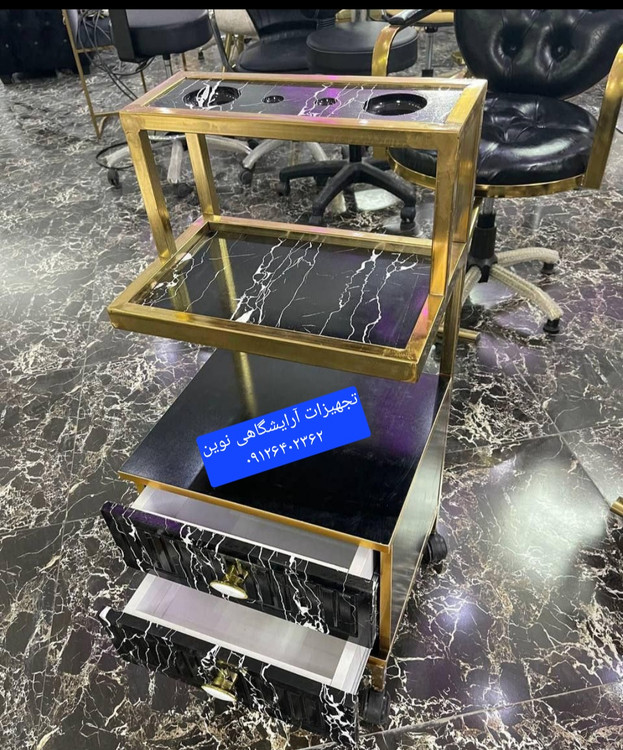 ترولی آرایشگاهی بدنه فلزی وچوب ام دی اف دررنگ بندی سفید ومشکی دارای دوکشو جاسشواری قسمت بالا میباشد