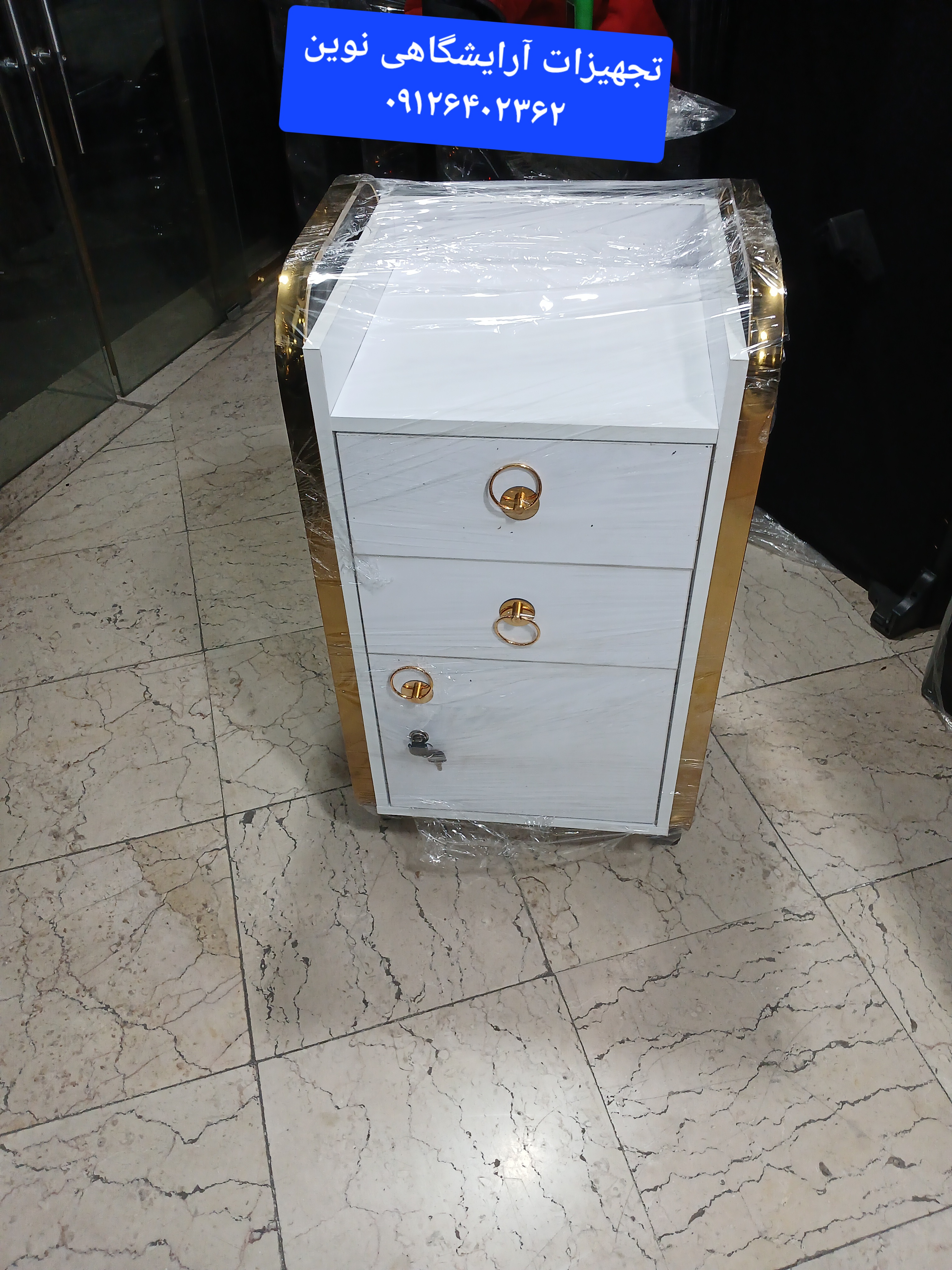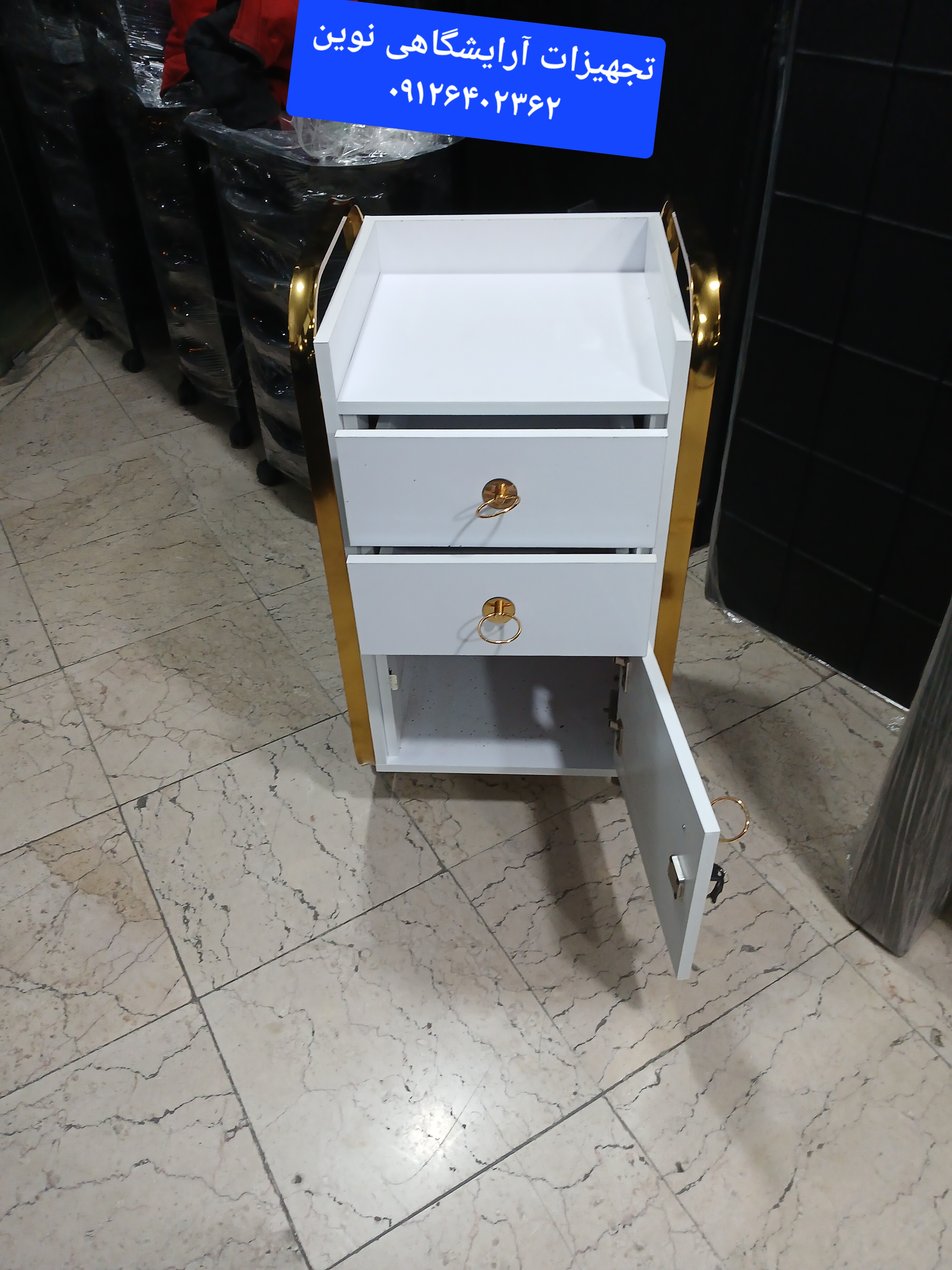 ترولی فلزی فایل دار دررنگ بندی سفید مشکی وآبکاری طلایی ونقره ای